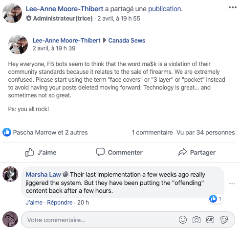 A la lumière de la loi sur les mesures de guerre invoquée par Trump le 2020-04-03 forçant la Chine à les prioriser pour les exportations de masques N-95 de grade médical, de nombreux groupes de couturières ont commencé à partager des patrons et informations pour organiser logistiquement la production de masques-maison. Des manufactures aux États-Unis ont également commencé à faire de la production de masse de masques pour donner aux professionnels de la santé et à la population. Toutefois, malgré ces beaux élans de solidarité, le géant Fb continue à faire de la censure en lien avec leurs « standards de communauté ». Le mot d’ordre dorénavant sera donc « couvres-visage » ou en anglais, « face-covers ».