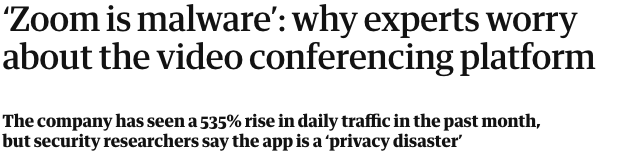 Vous voulez faire une réunion zoom avec des amis ou collègues pendant le confinement?Peut-être cherchez d’autres alternatives. Un article du Guardian note que Zoom a connu une augmentation de 535% de son utilisation dans les dernières semaines mais il s’agit d’une compagnie corrompue qui protège peu la confidentialité des données des utilisateurs.
