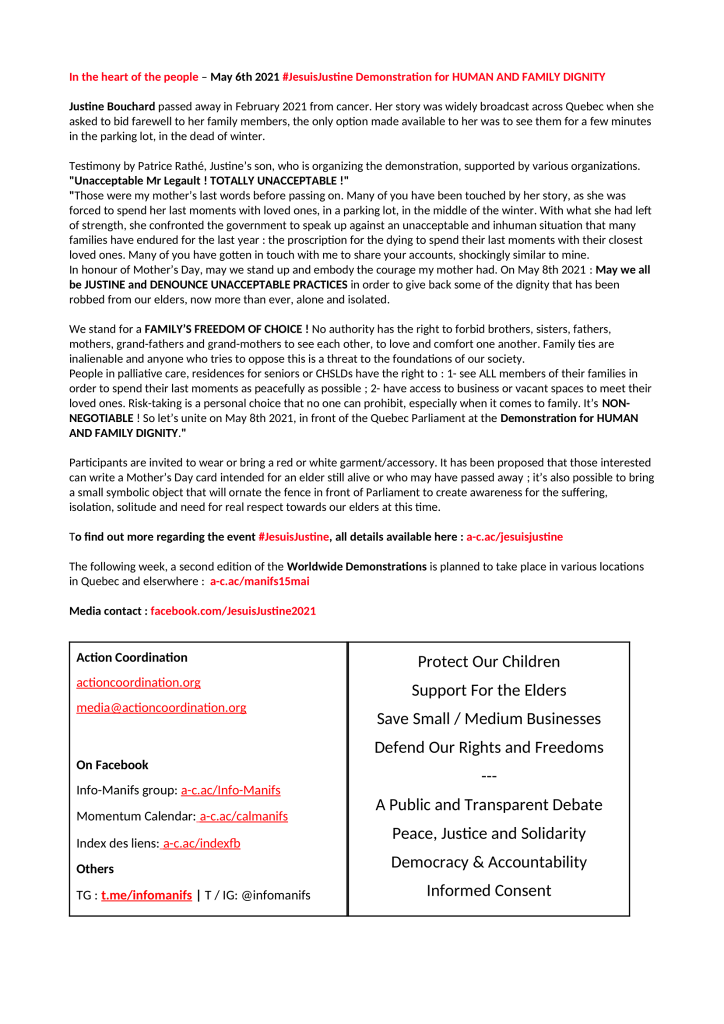 Les personnes en soins palliatifs, en résidence ou en CHSLD doivent avoir le droit : 1- de voir TOUS les membres de leur famille afin de vivre leurs derniers moments de façon sereine; 2- d’avoir accès aux commerces et espaces actuellement vacants pour rencontrer leurs proches. La prise de risques est un choix personnel que nul ne peut interdire, surtout lorsqu’il s’agit de la famille. C’est NON-NÉGOCIABLE! Alors unissons-nous le 8 mai 2021 au Parlement de Québec pour la Manifestation pour la DIGNITÉ HUMAINE et FAMILIALE »